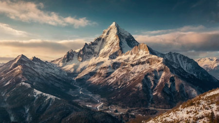 A high-angle view captures a towering mountain peak, its upper reaches blanketed in snow. The scene is illuminated by the warm hues of a setting sun. The rugged terrain and the interplay of light and shadow create a dramatic effect, suitable for various editorial and commercial applications.