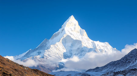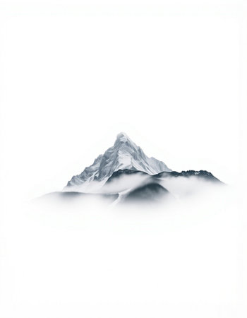Experience the breathtaking beauty of a majestic snow-capped mountain peak blanketed in fog under a serene blue sky, showcasing nature's grandeur and tranquility.