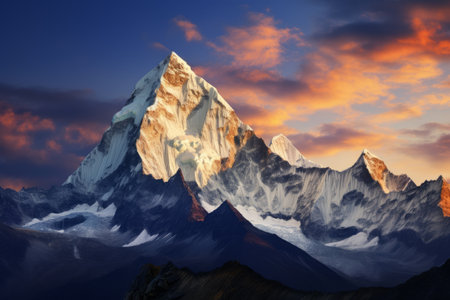 A stunning view of a snow-capped mountain peak illuminated by the golden light of the setting sun in the Himalayas.