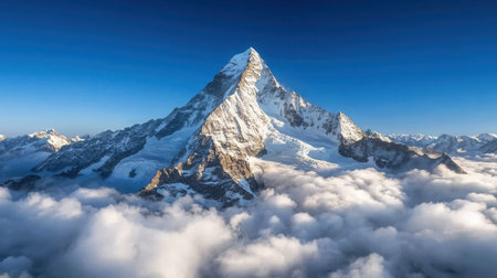 Majestic mountain peaks capped with snow tower above swirling clouds, creating a stunning contrast against the clear blue sky, revealing nature's grandeur at dawn.