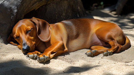 A small brown dog sleeps peacefully on the sandy ground beneath a tree, showcasing serenity and comfort in a natural outdoor setting.