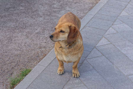 one brown dog stands on a gray pavement in the street