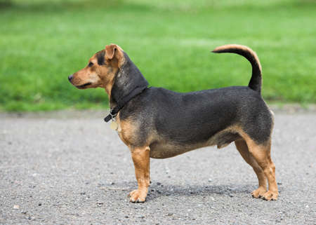 Dachshund the dog in the park on the grass stands