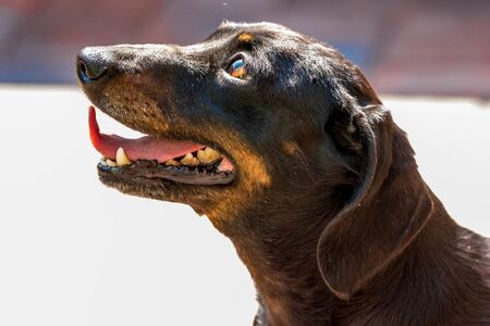 Beautiful dachshund sitting on the grass. Happy dog with open mounth and tongue.