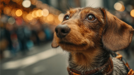 An adorable dachshund with a curious expression on his face looks intently into the camera against the backdrop of blurry city lights and crowds.