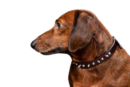 Horizontal shot of a red dachshund looking off camera to the left. Isolated on white.