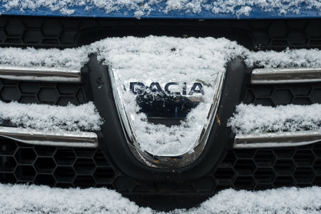 Mulhouse - France - 27 January 2021 - Closeup of Dacia logo on the famous SUV sandero car front covered by the snow
