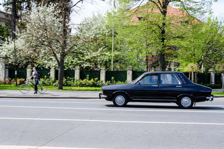 Bucharest, Romania, 24 April 2021 Old retro black Romanian Dacia 1300 classic car in traffic in a street in a sunny spring day