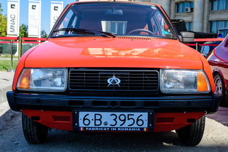Bucharest, Romania, 2 October 2021: One red Oltcit Special vintage car produced in year 1986 and parked in a street at an event for vintage cars collections, in a sunny autumn day