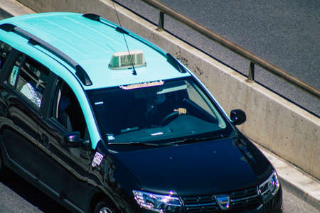 Lisbon Portugal july 25, 2020 View of a taxi for passengers driving through the streets of Lisbon, the hilly coastal capital city of Portugal and one of the stunning oldest cities in Europe