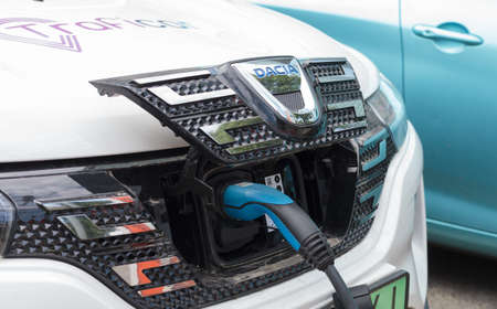 Warsaw, Poland - June 05.2021: Traficar is car sharing company, electric cars charging on street. Close-up carsharing car DACIA.