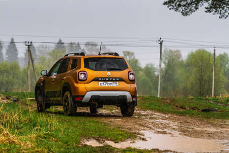 MOSCOW, RUSSIA - MAY 08, 2021 Renault Duster second generation. Compact SUV car also called Dacia Duster. Close up side view on nature off-road obstacle. Orange 4x4 car.