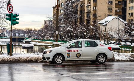Firefighting care stopped at red light in a icy winter morning in Bucharest, Romania, 2020