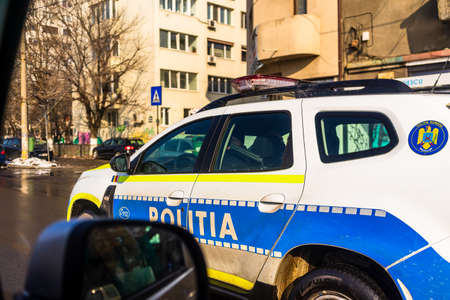 Romanian police (Politia Rutiera) car in traffic on the streets of Bucharest, Romania, 2021