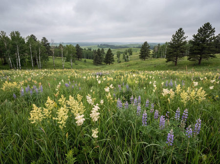 A breathtaking landscape features a lush green meadow filled with yellow and purple wildflowers surrounded by birch and pine trees on rolling hills under a soft overcast sky during summer season.