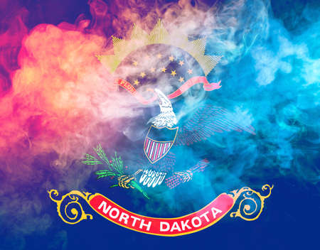 The national flag of the US state North Dakota in against a gray smoke on the day of independence in different colors of blue red and yellow. Political and religious disputes, customs and delivery.