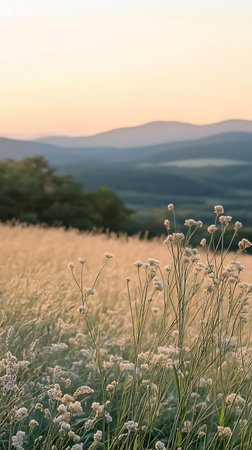 This picturesque image showcases a field of wild white flowers blooming amidst tall grass, with a beautiful sunset and distant mountain range adding depth to the tranquil scenery.