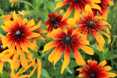 focus on orange flowers helenium on the green background, note shallow depth of field