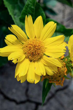 Yellow flower on the dry cracked ground. Ecological water problems, life victory concept