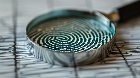 A magnifying glass observing a fingerprint with green hues.