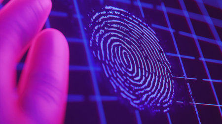 This high-tech image showcases a fingerprint scan against a vibrant neon grid, symbolizing advanced identification and security technology in modern applications.