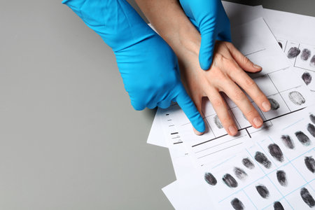 Investigator taking fingerprints of suspect on gray table, closeup. Space for text