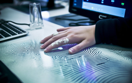 An intricate fingerprint pattern is showcased on a transparent pad in a contemporary tech environment. The clarity highlights unique ridges and valleys of the print.