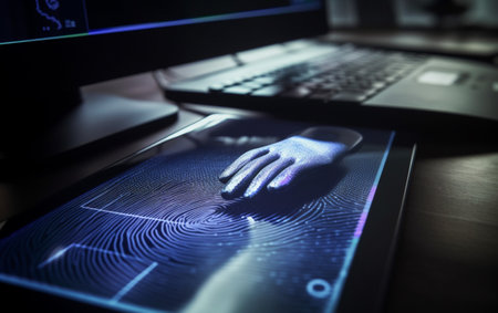Intricate fingerprint sensor design showcased on a circuit board with a high-tech aesthetic in a modern setting