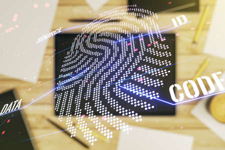 Multi exposure of abstract graphic fingerprint sketch and modern digital tablet on desktop on background, top view, fingerprint scan data concept