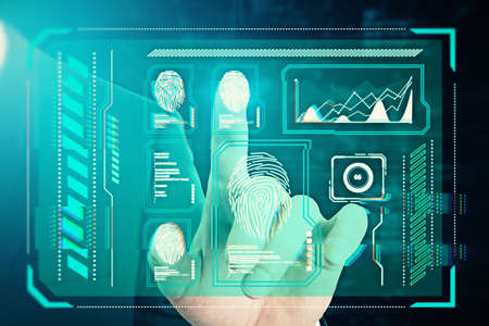 Fingerprint scanning and biometric authentication identification, ID password, technology and cybernetics. Personal business data protection cyber security. Recognition, innovation of future.