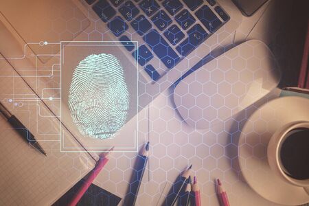 Finger print over computer on the desktop background. Top view. Double exposure. Concept of securitization.
