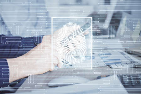 Fingerprint hologram with businessman working on computer on background. Security concept. Double exposure.
