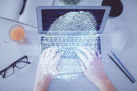 Double exposure of woman hands working on computer and fingerprint hologram drawing. Top View. Digital Security concept.
