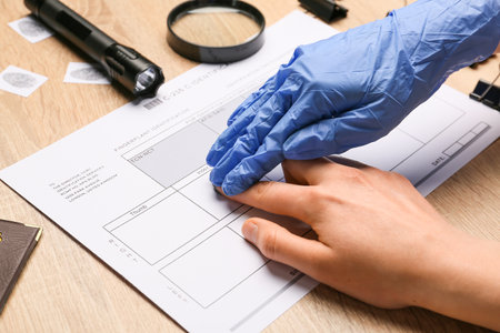 Forensic expert taking finger print of woman on table
