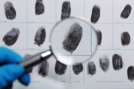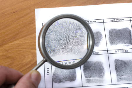 Criminalist exploring fingerprints with magnifying glass, closeup