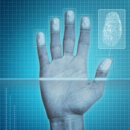 Fingerprint being scanned by a high tech security system with a warm orange and cool blue bokeh