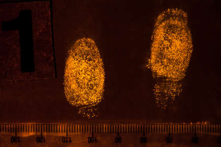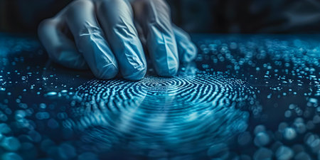 Forensic analysis focusing on a fingerprint at a crime scene investigation. Concept Fingerprint Identification, Crime Scene Investigation, Forensic Analysis, Law Enforcement, Evidence Collection