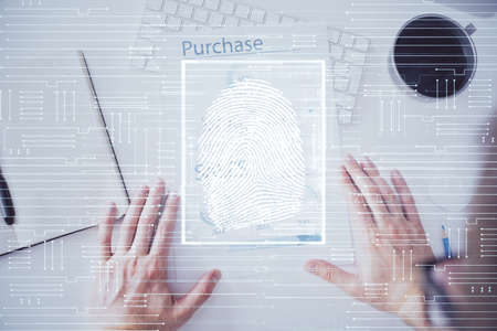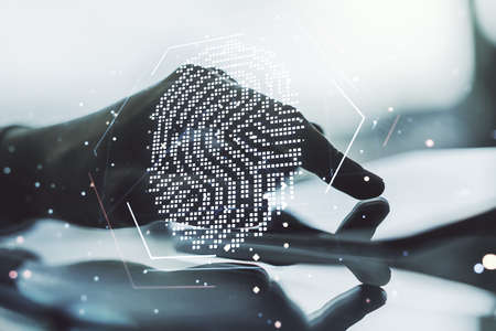 Double exposure of man's hands holding and using a digital device and fingerprint hologram drawing. Security concept.