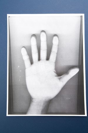 A closeup image showing a persons hand with a distinctive pattern on the skin surface