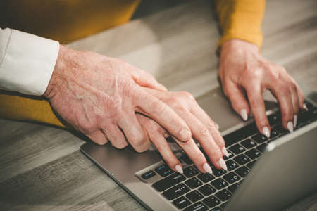 Hand and computer keyboard close up. Man working at home office hand on keyboard close up. Selective focus.