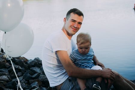 Little boy 1 year old with his father playing with balloons, birthday, summer