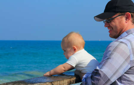 Baby in the arms of dad. Walk near the water. Baby and dad against the sky