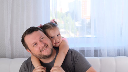 Lovely father and his daughter embracing and cheering on the sofa while looking at camera