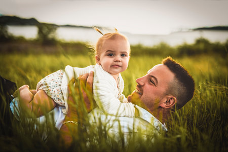 father and baby child girl at the sunset lay on the grass on the waterscape view from back