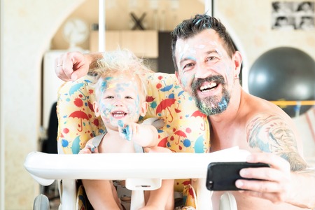 Father and little son laugh and do selfie on the phone. The faces and hair are stained with multicolored paints. Happy family. Great weekend together.