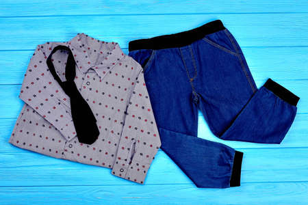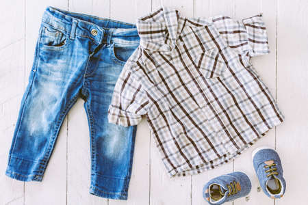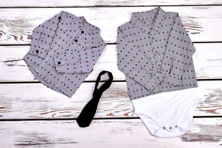 Baby boy modern shirt and bodysuit. Child boys fashion design spring or autumn apparel, white wooden background. Kids boutique garment.