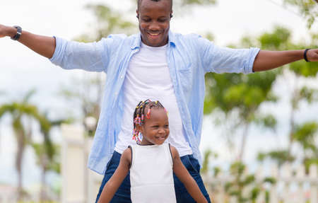 Happy father playing with daughter, Cheerful african american girl playing with her father