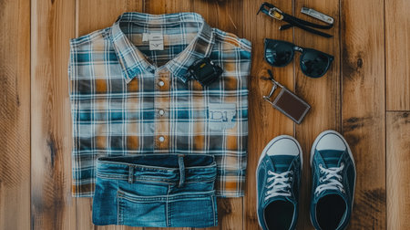 Stylish casual outfit flat lay featuring a plaid shirt, jeans, sneakers, and accessories on a wooden surface, perfect for fashion inspiration.