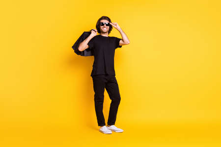 Full length photo of young man hold shopping packages glasses wear black t-shirt pants white sneakers sunglass isolated yellow color background