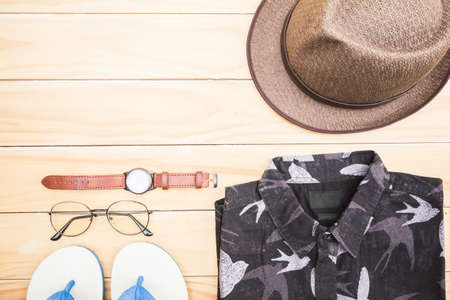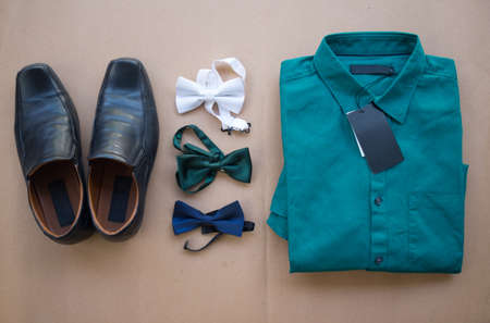 Men's casual outfits, jean shirt with bow tie, pants on wooden table background